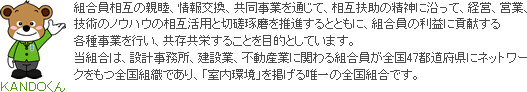 ![]() 「全国室内環境改善事業協同組合」は、国土交通大臣より認可を得て、平成21年7月に設立いたしました。 全国各地の地域不動産・建設業の事業発展と地位向上を目指し、「ものを大切にする」「地球環境に配慮する」を基本コンセプトとしています。 環境改善のキーワードは、「クリーンテックを活用した建物・室内・生活環境改善」です。クリーンエネルギー、省エネルギー、リサイクル、クリーンウォーター、クリーンヘルスなど、新しい技術革新に支えられ、世界は環境改善に向けて急速に変化しています。個の大きな変革の時期こそ中小企業が連携し、当組合を通じて技術を導入し、ノウハウを共有することで、変革する時代、多様化する消費者ニーズに応えることが出来ると考えています。 組合員が、技術力や経営基盤の強化を図り、社会的信頼を高め、住環境の改善に貢献できる組織を目指して努力してまいります。 |